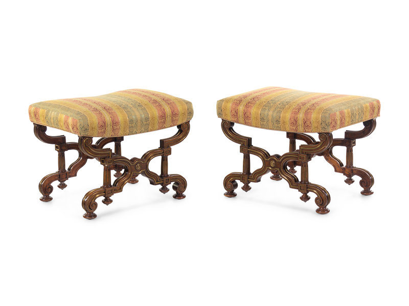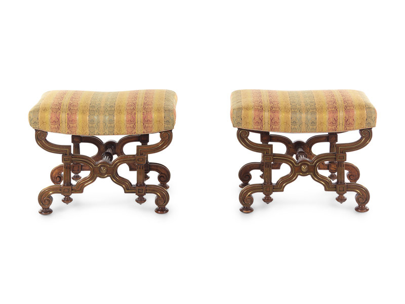 A Pair of Russian Empire Bronze Mounted Oak Curule-Form Tabourets