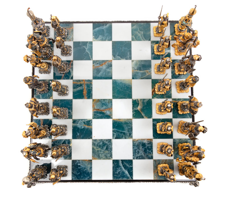 the game board in alternating blue onyx and white marble squares, raised on a silvered bronze base.