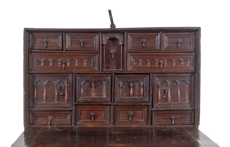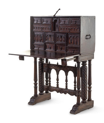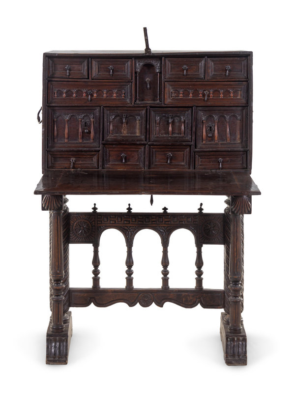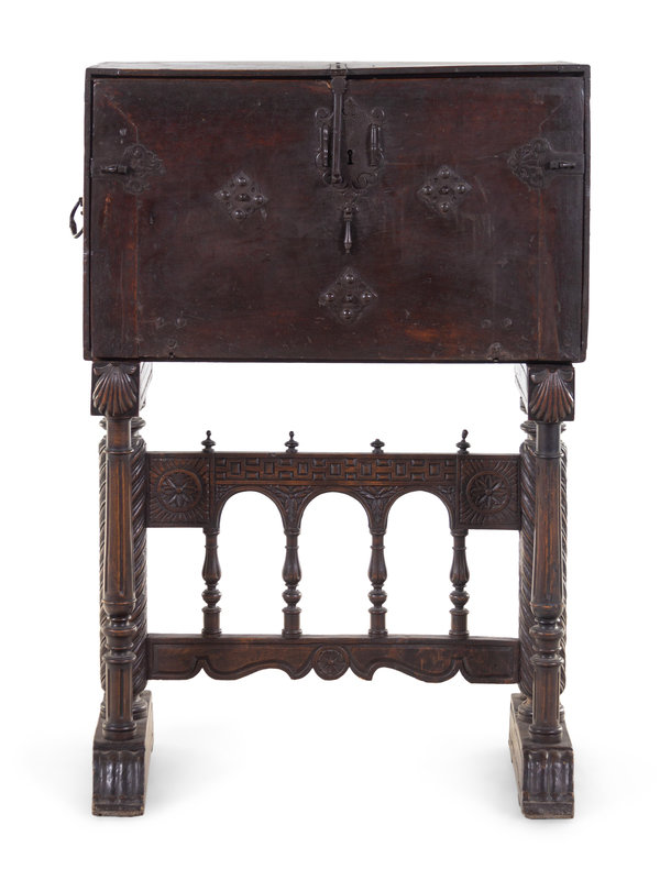 A Spanish Iron Mounted Carved Walnut Vargueño on Stand