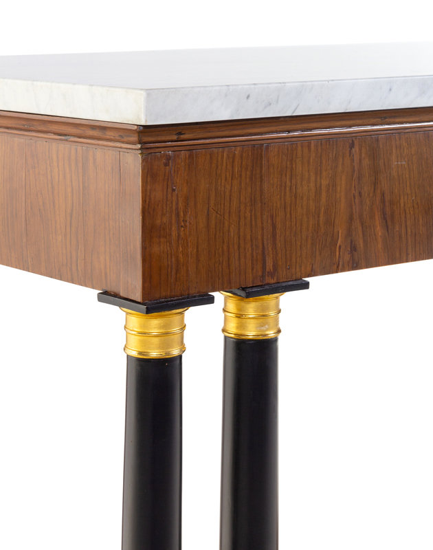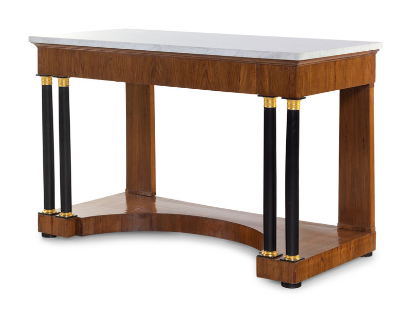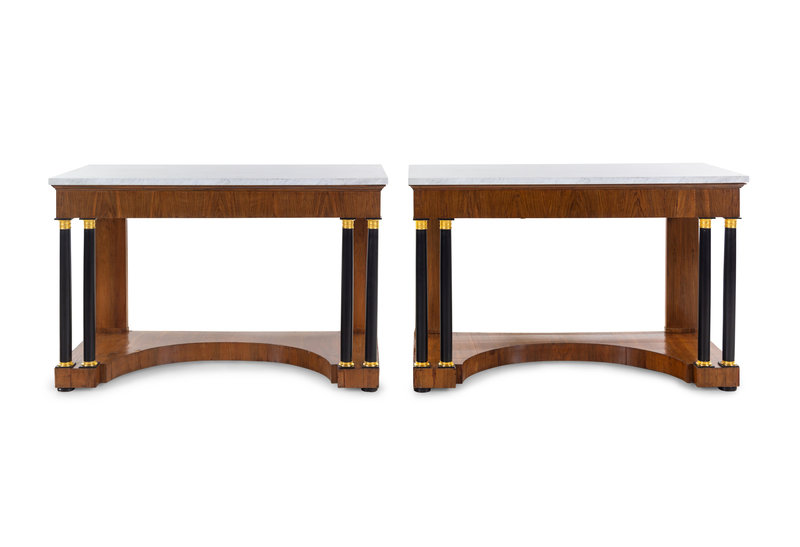 A Pair of Russian Empire Gilt Metal Mounted Parcel Ebonized Mahogany Marble-Top Console Tables