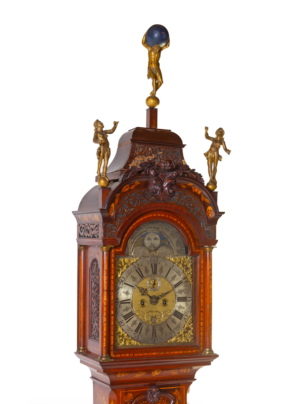 the blind-fretwork decorated hood surmounted by carved giltwood figures of Atlas and two nude maidens standing atop orbs, the brass dial signed Antoni Van Oostrom/ Amsterdam, the case centered with a lenticle depicting Father Time, raised on claw-and-ball feet.