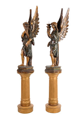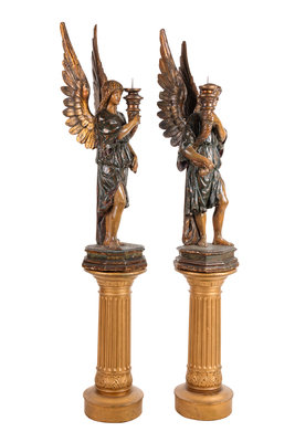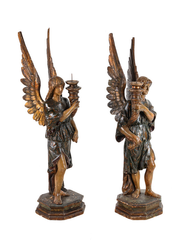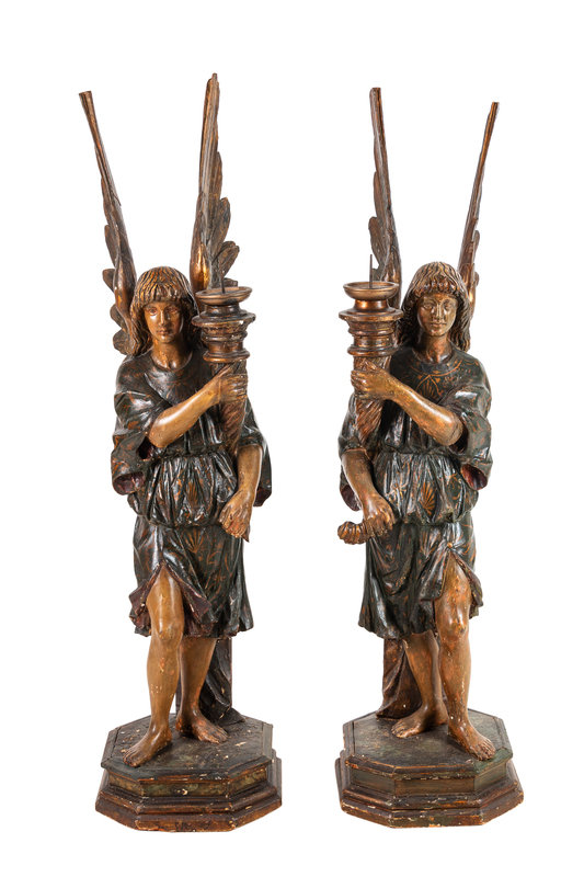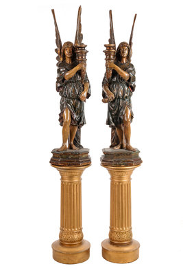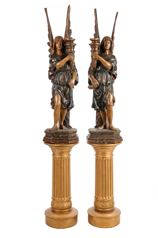 A Pair of Continental Carved and Painted Figural Prickets with Associated Pedestals