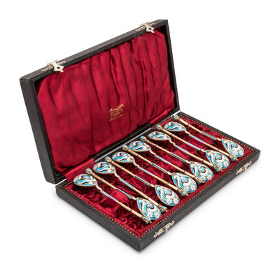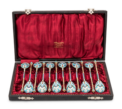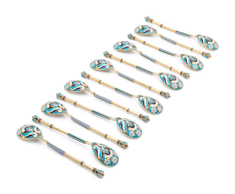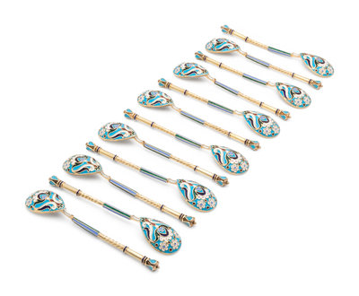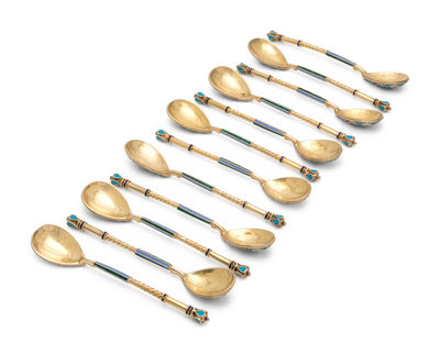 A Set of Twelve Russian Silver-Gilt and Enamel Teaspoons