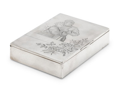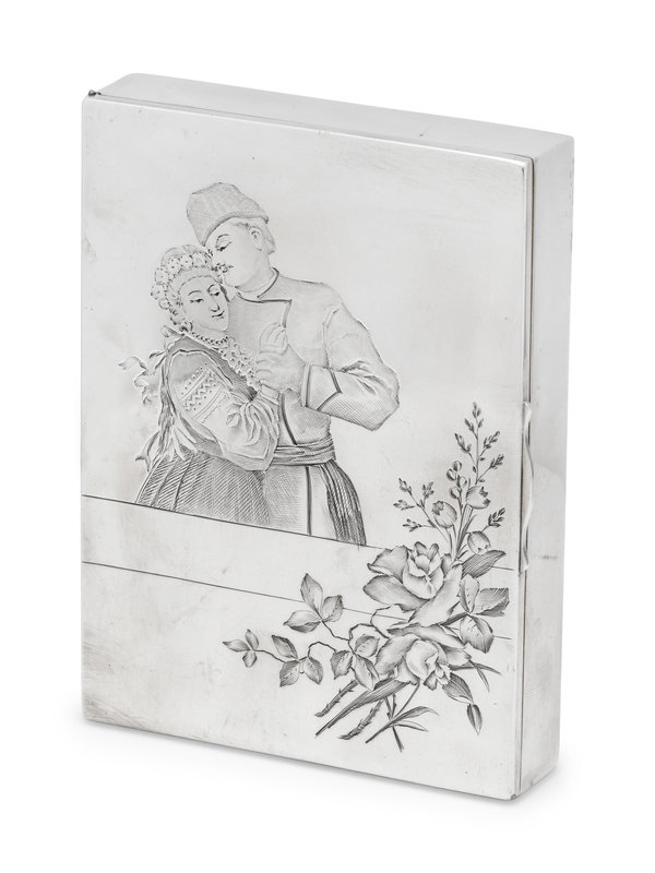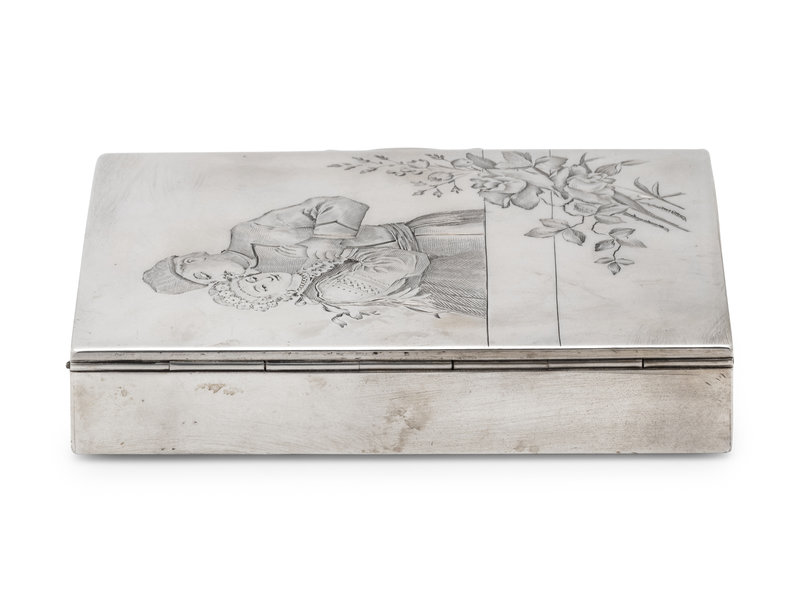 the lid engraved to show an embracing couple and a floral spray.