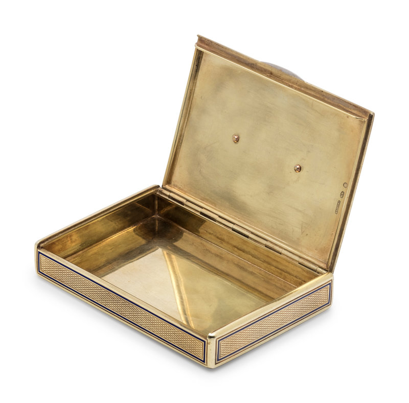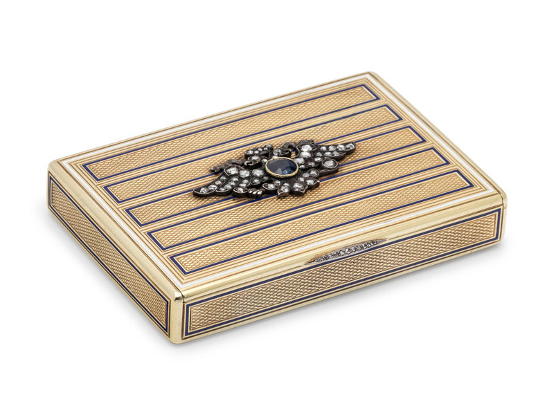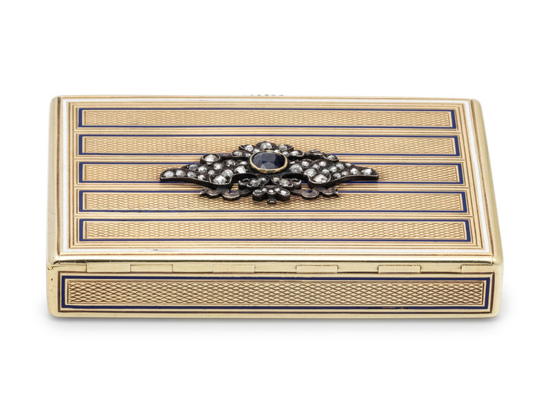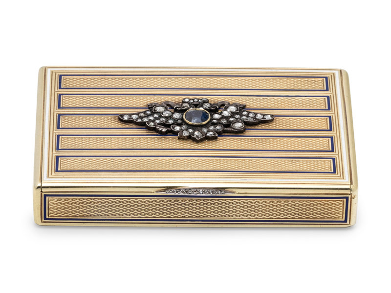 A Russian Yellow Gold, Enamel, Diamond and Sapphire Mounted Snuff Box