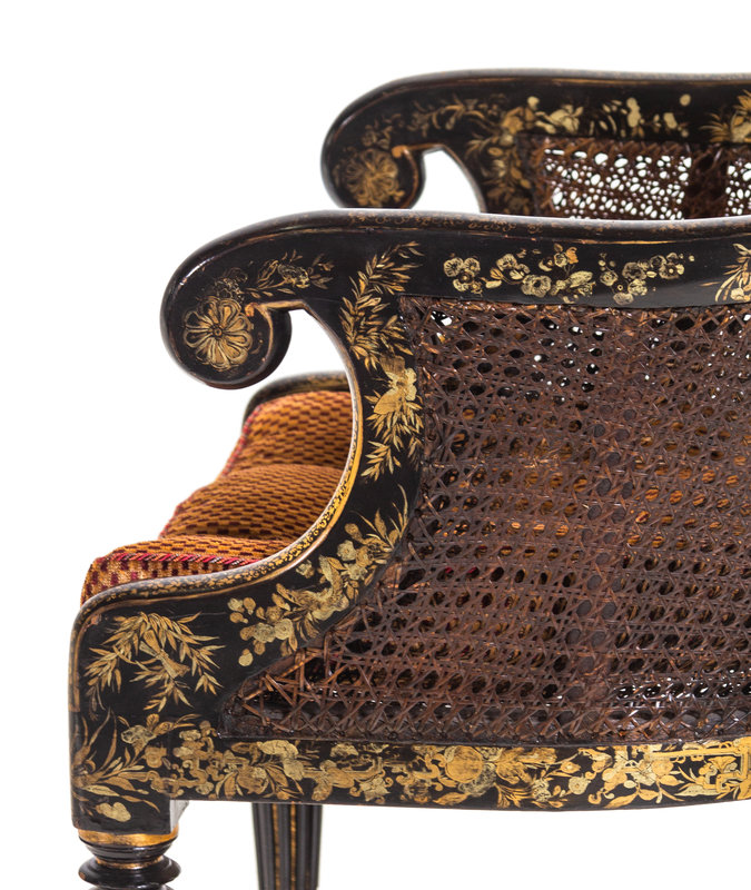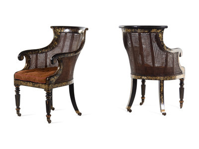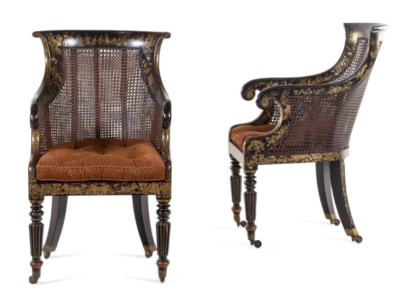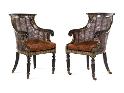 A Pair of William IV Parcel Gilt Japanned and Cane Upholstered Armchairs
