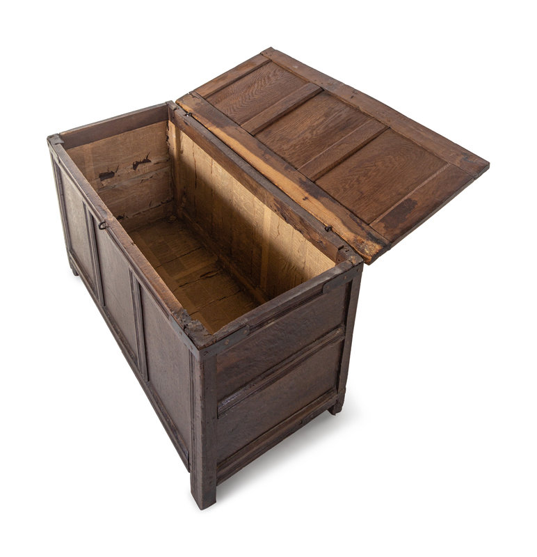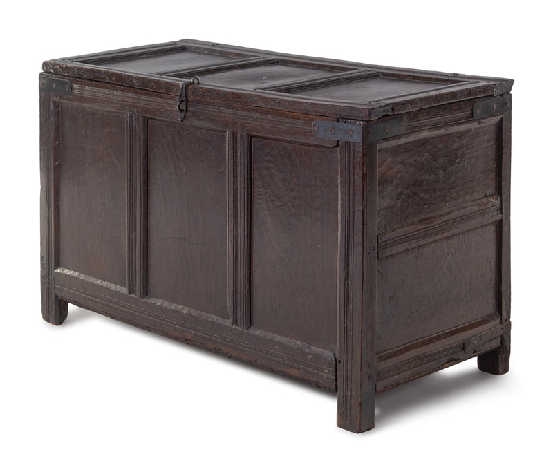 A Jacobean Iron Mounted Molded and Paneled Oak Storage Chest