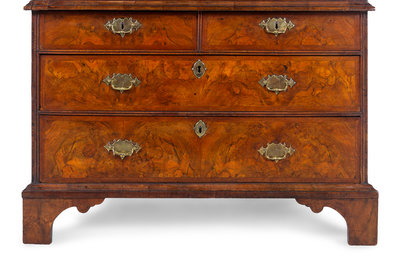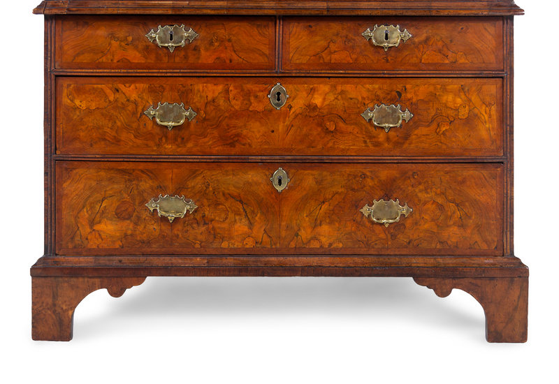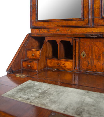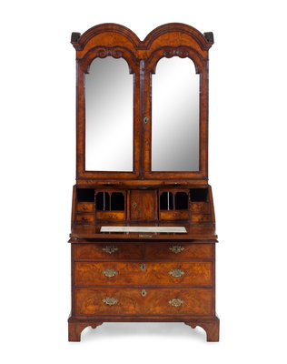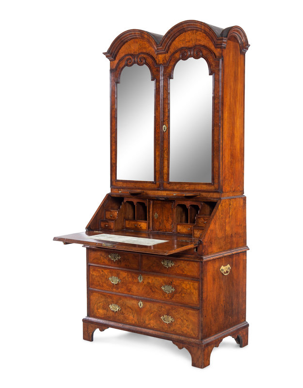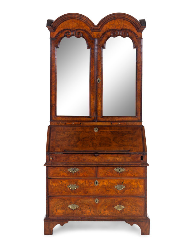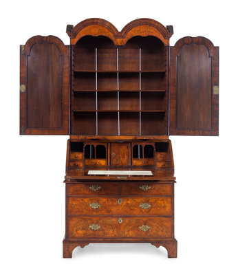 A George I Carved Burl Walnut Double-Dome Bureau Bookcase