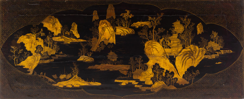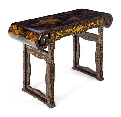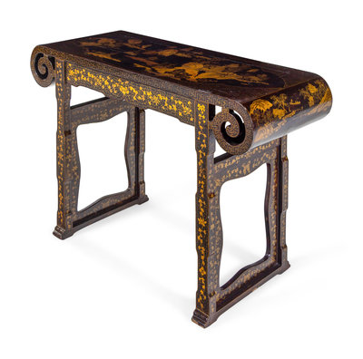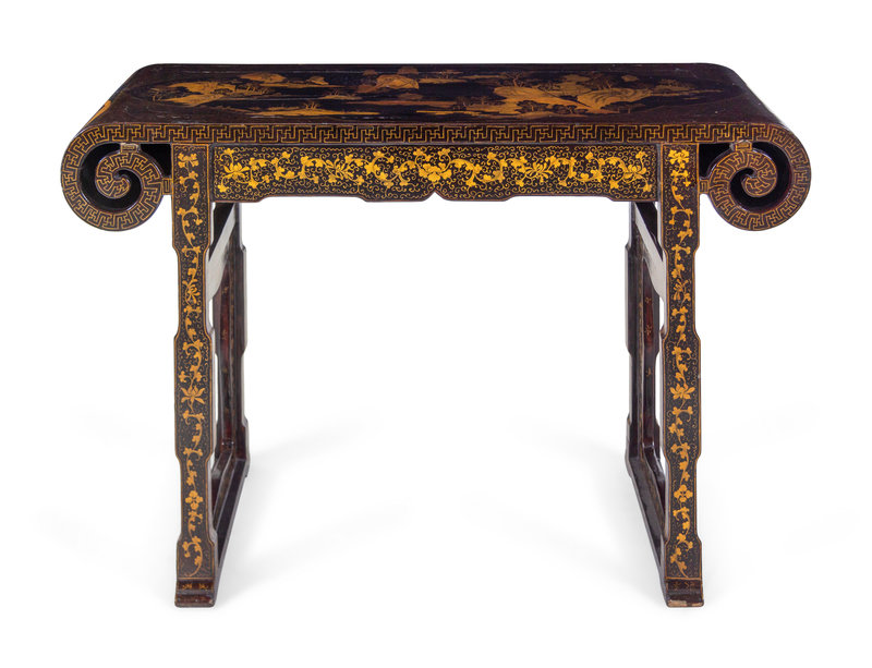 A Chinese Export Black and Gilt Lacquered Scroll Table