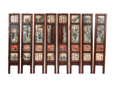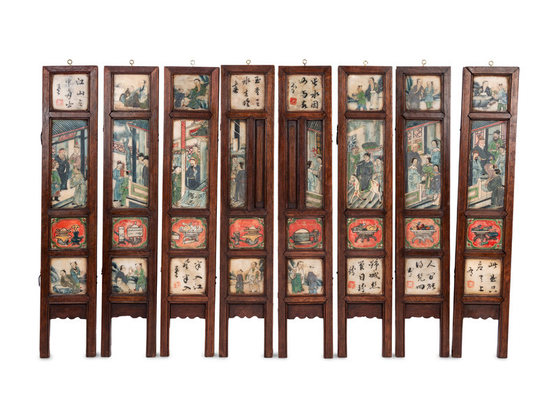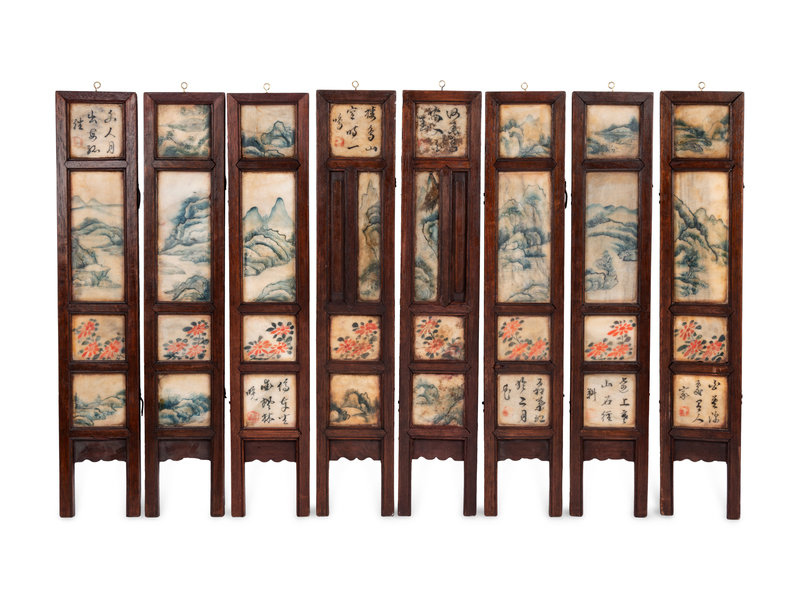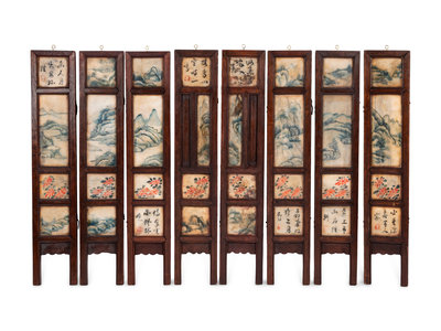 A Chinese Painted and Hardstone Inset Wood Eight-Panel Table Screen