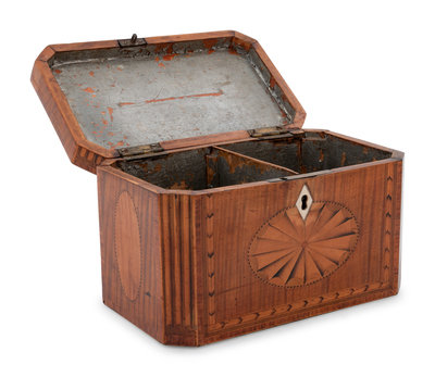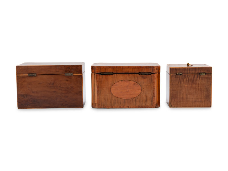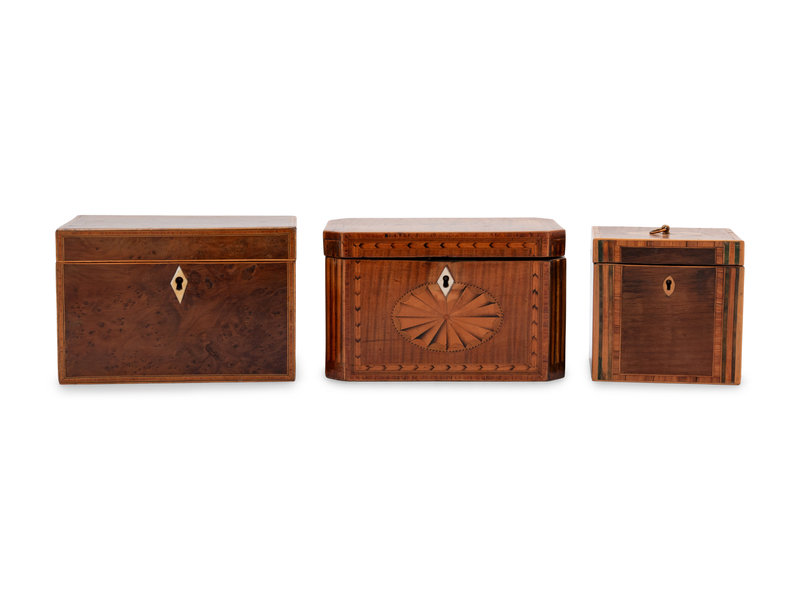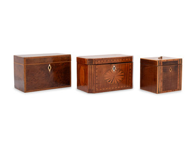 Three George III Mahogany or Burl Walnut and Satinwood Marquetry Tea Caddies