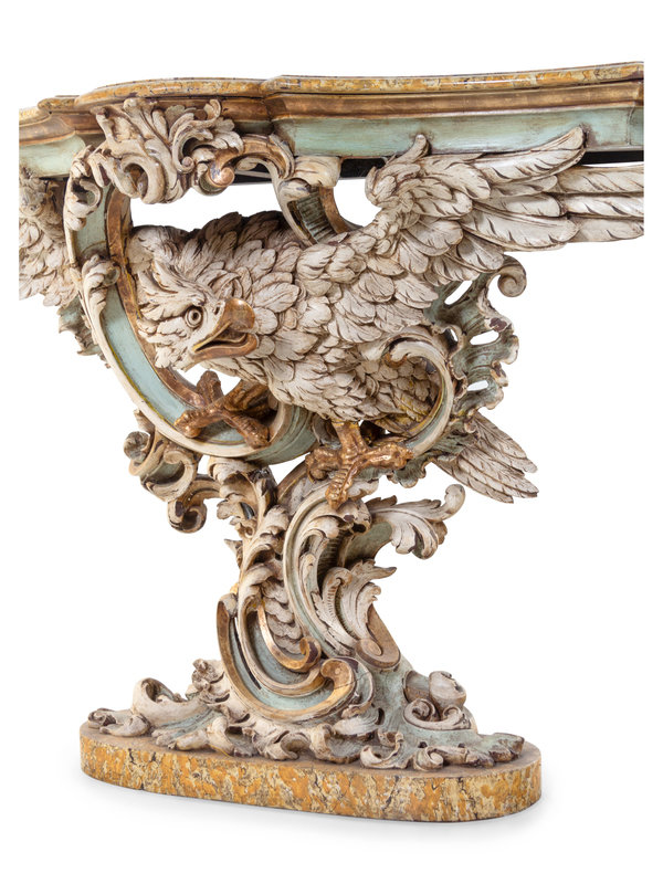 A Pair of George III Style Painted and Parcel Gilt Pier Tables with Faux Marble Tops
