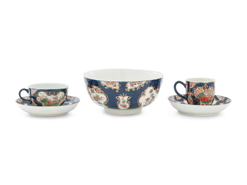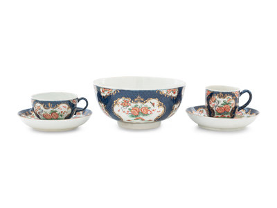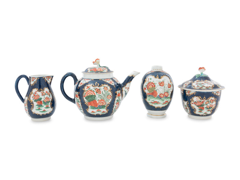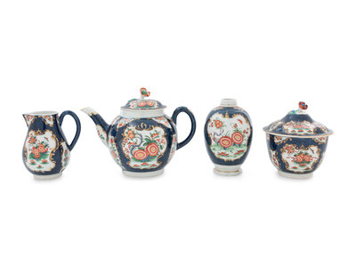 blue scale Kakiemon palette, comprising a teapot, covered sugar, creamer, caddy bottle, waste bowl, 5 coffee cups, 8 teacups and 8 saucers; 26 items total.