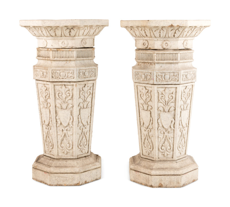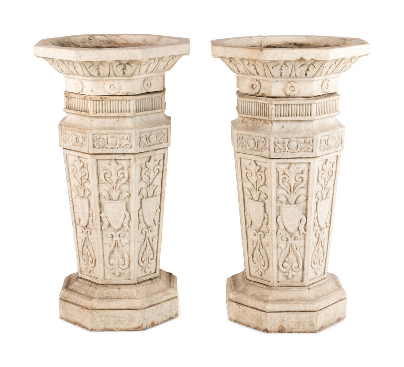 A Pair of Glazed Terra Cotta Urns and Pedestals