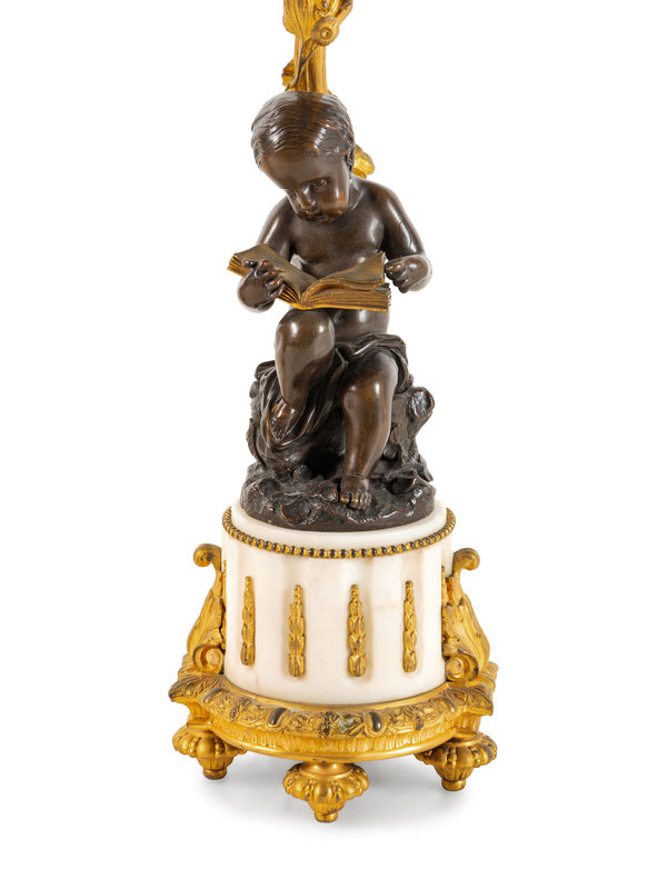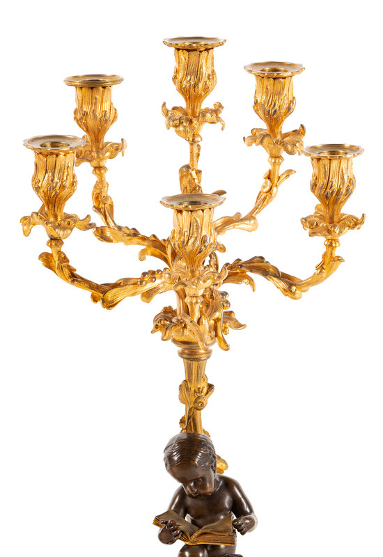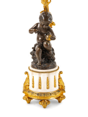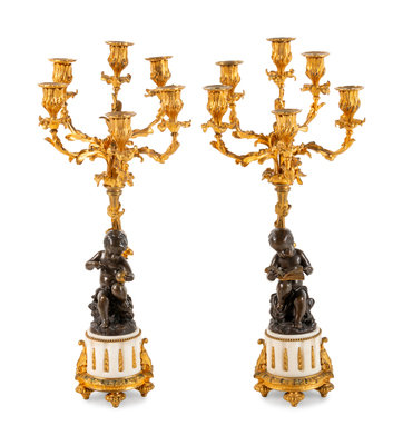 A Pair of Louis XVI Style Gilt and Patinated Bronze Six-Light Figural Candelabra