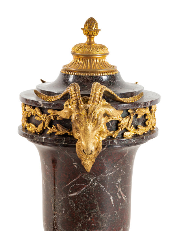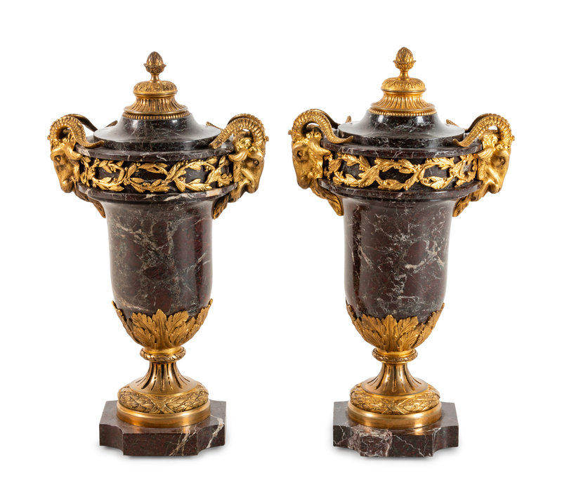 A Pair of Louis XVI Style Gilt Bronze Mounted Marble Urns