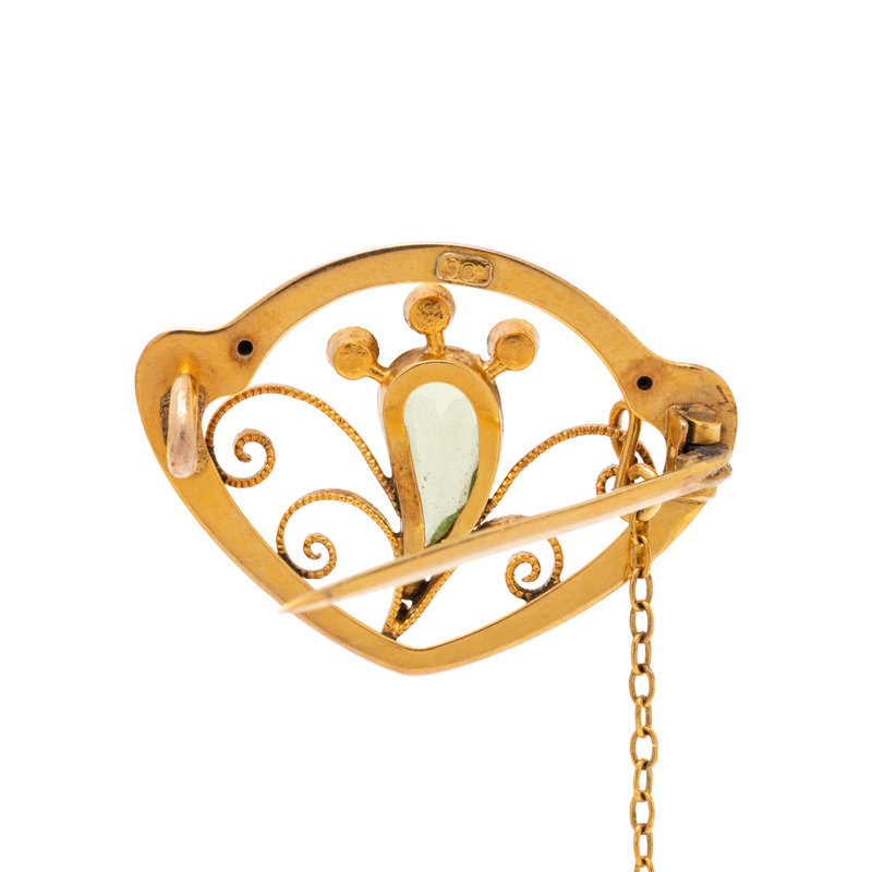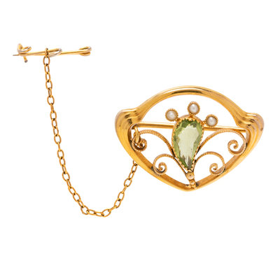 ART NOUVEAU, YELLOW GOLD, PERIDOT AND SEED PEARL BROOCH