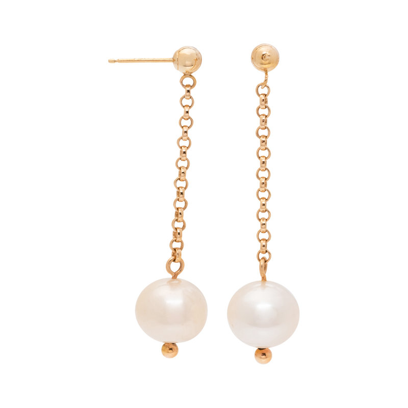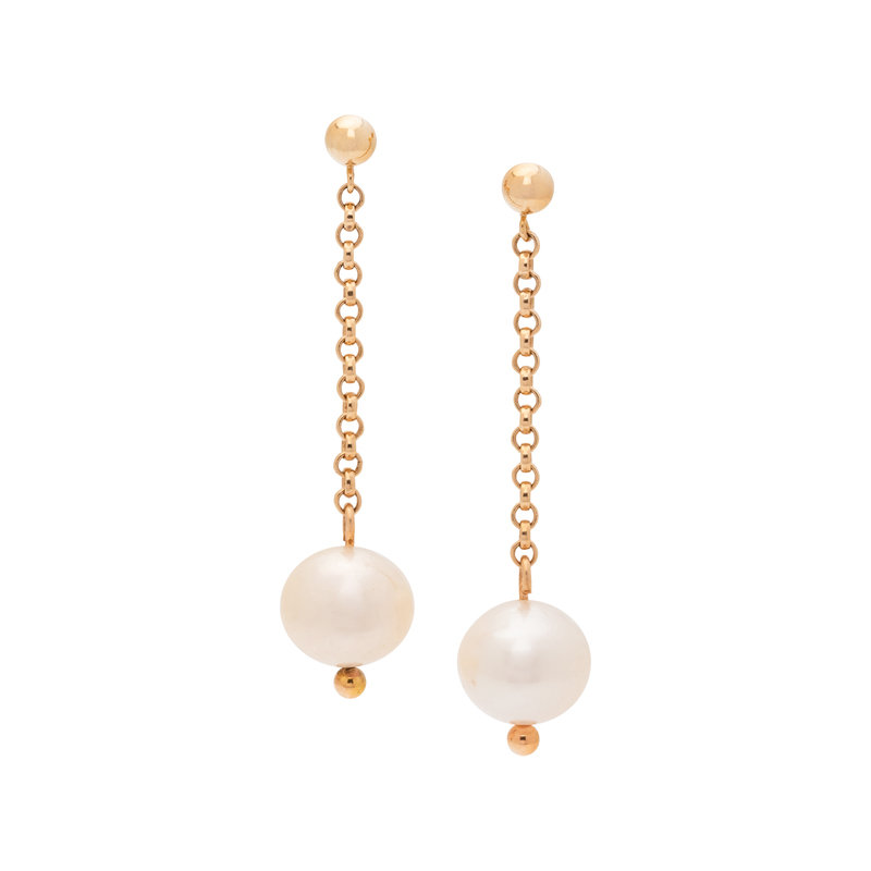 Consisting of cable link chain suspending two pearls measuring approximately 10.00 mm in diameter.