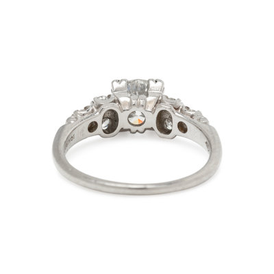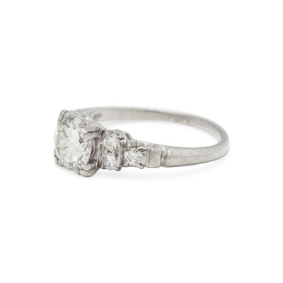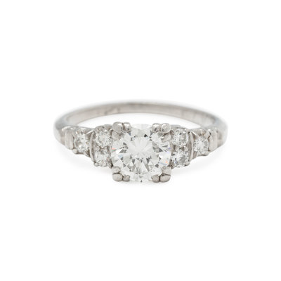 Containing one round brilliant cut diamond weighing approximately 1.00 carat and six round brilliant cut diamonds. Mounted in platinum.