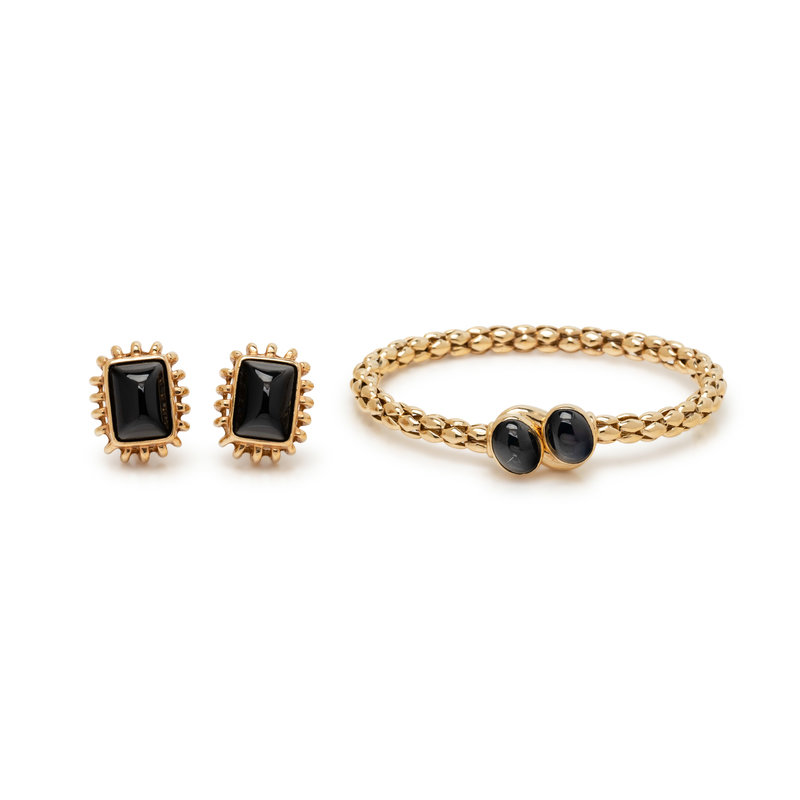 Consisting of a pair of earclips containing two rectangular sugarloaf cabochon onyx measuring approximately 13.00 x 9.35 x 6.65 mm, together with a semi-flexible bangle bracelet with bypass style clasp containing two oval cabochon sapphires measuring approximately 9.70 x 7.50 x 5.00 mm.