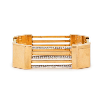Consisting of a semi-flexible bangle bracelet containing 180 round brilliant cut diamonds weighing approximately 2.70 carats total.