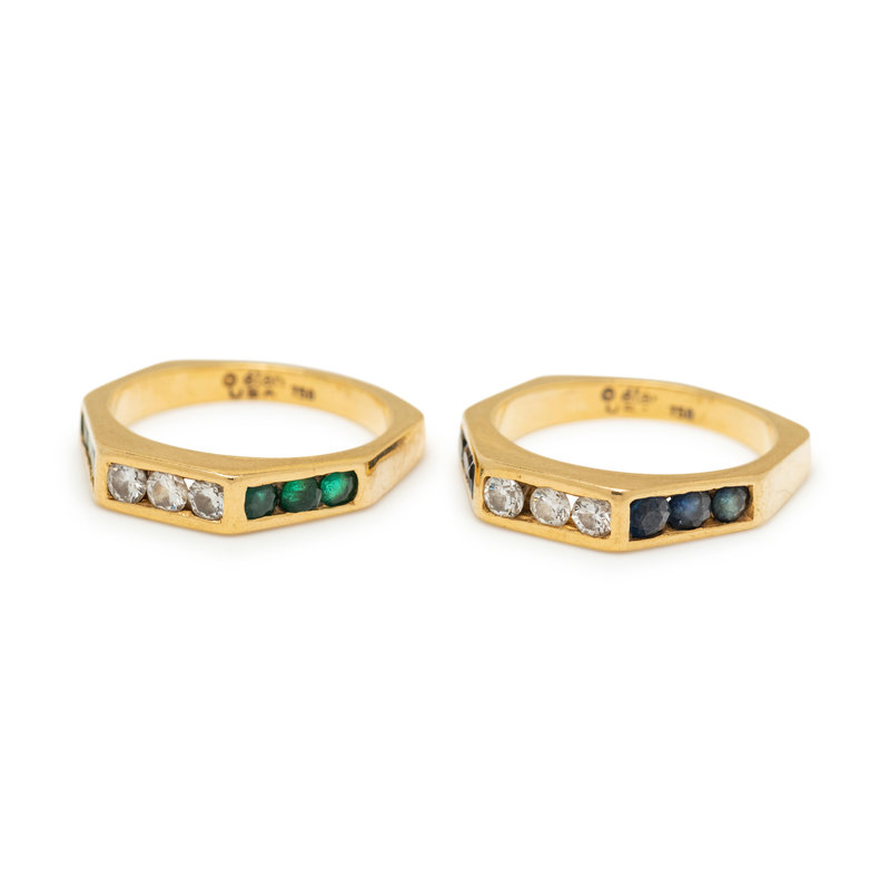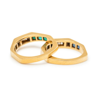 Consisting of a ring containing three round brilliant cut diamonds weighing approximately 0.15 carat and six round mixed cut emeralds, together with a ring containing three round brilliant cut diamonds weighing approximately 0.15 carat total and six round mixed cut sapphires. Mounted in yellow gold.