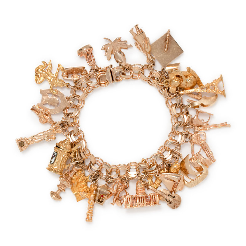 Consisting of a fancy link bracelet suspending a Danish Little Mermaid charm, a telephone charm, a gold-plated figure charm, a Pennsylvania Dutch horseshoe and figure charm, a Statue of Liberty charm, a Viking charm, a #1 charm containing one diamond, an urn charm, a Munchen beer stein charm, a Mount Rushmore charm, a totem pole charm, a lantern charm, a gold-plated figure with carrying pole charm, a US Capitol charm, a violin charm, a sailboat charm, a gold-plated figure charm from Fiji, a gold nugget charm, a Norwegian Viking boat charm, a Matador charm, a New Zealand kiwi charm, a gun charm, a wooden clog charm, a cactus charm, a beehive charm, a gold-plated Eiffel Tower charm, a graduation cap charm, a koala charm, a gold-plated soldier charm and a maple leaf charm.