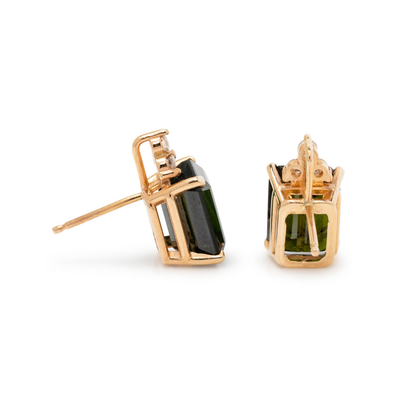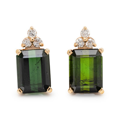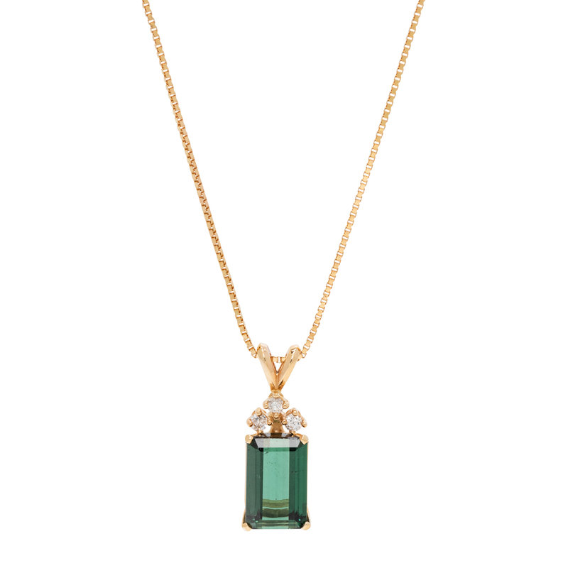 Consisting of a pendant/necklace containing one emerald cut green tourmaline measuring approximately 11.20 x 7.10 x 4.00 mm and three round brilliant cut diamonds, suspended from a box chain necklace, together with a pair of stud earrings containing two emerald cut green tourmalines measuring approximately 9.00 x 7.00 x 5.15 mm and six round brilliant cut diamonds weighing approximately 0.15 carat total. Mounted in yellow gold.