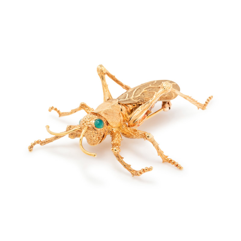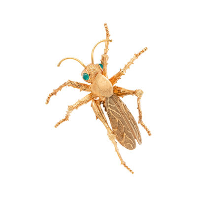 Consisting of a textured gold body and two round cabochon green gemstone eyes.