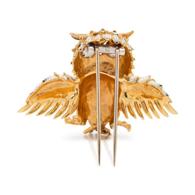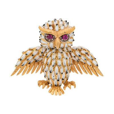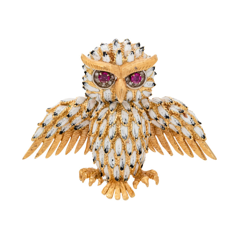 Consisting of an owl with white and black enamel feathers, two round mixed cut ruby eyes and 10 single cut diamonds. Mounted in yellow gold.