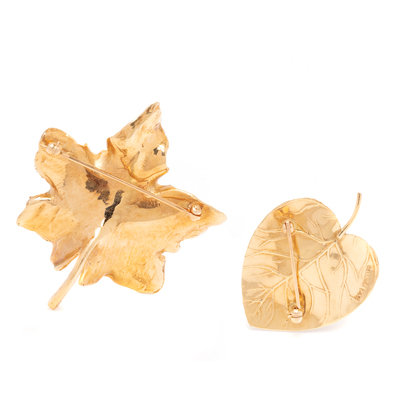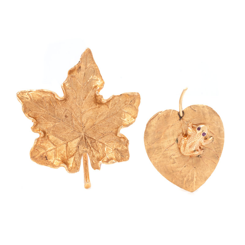 Consisting of a textured leaf brooch, together with a textured leaf brooch with frog.