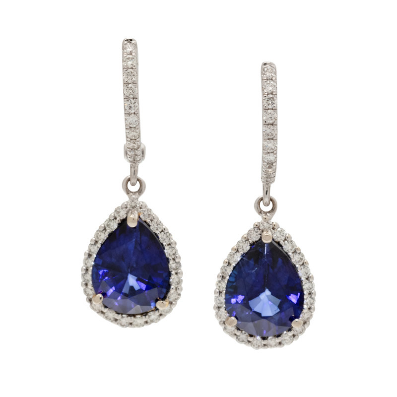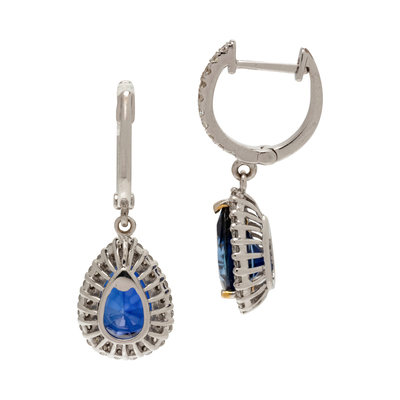 Containing two pear mixed cut sapphires measuring approximately 8.90 x 7.05 x 4.50 mm and 62 round brilliant cut diamonds weighing approximately 0.30 carat total. Mounted in white gold.