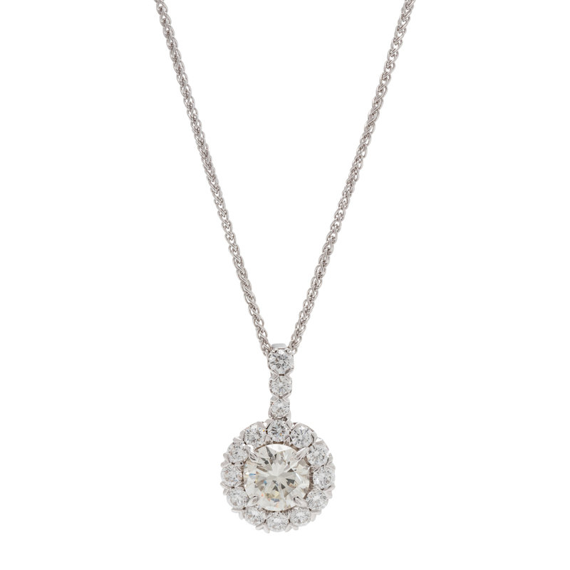 Containing one round brilliant cut diamond weighing approximately 0.90 carat and 15 round brilliant cut diamonds weighing approximately 0.45 carat total, suspended from a wheat chain. Mounted in white gold.