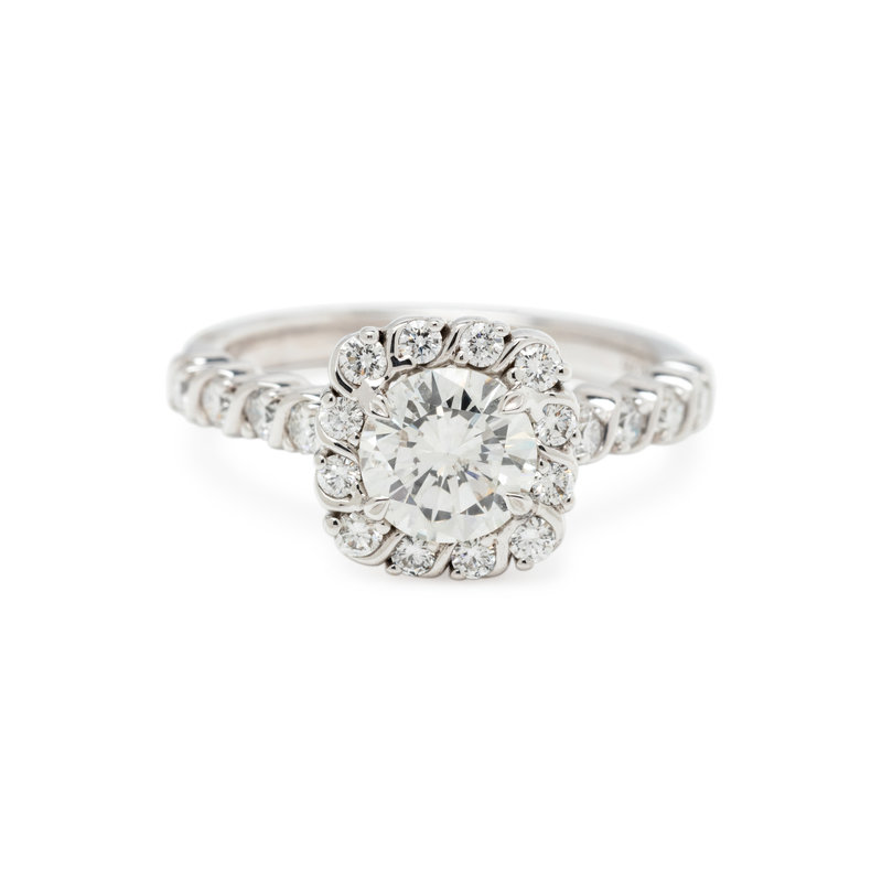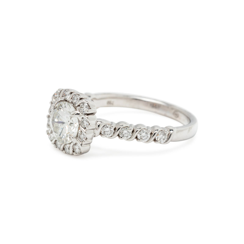 Containing one round brilliant cut diamond weighing 1.05 carats and 20 round brilliant cut diamonds weighing approximately 0.45 carat total. Mounted in white gold.