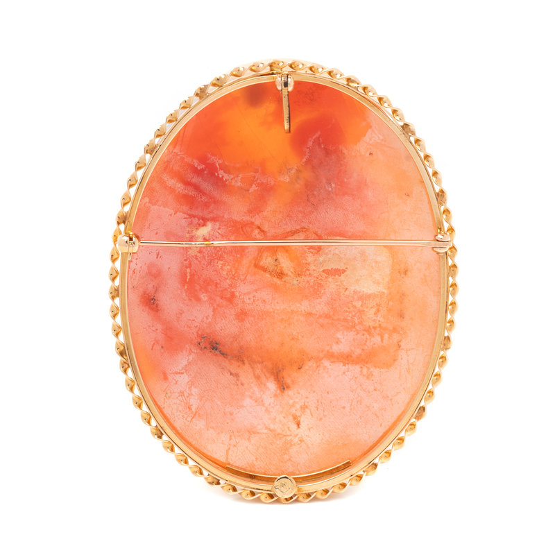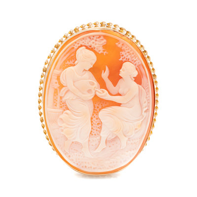 Containing one oval carved cameo depicting two women measuring approximately 59.00 x 45.00 mm. Mounted in yellow gold.