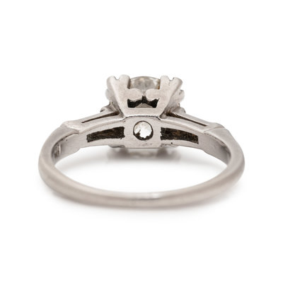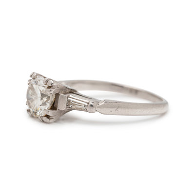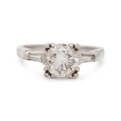 Containing one round brilliant cut diamond weighing approximately 1.25 carats and two tapered baguette cut diamonds weighing approximately 0.10 carat total. Mounted in platinum.