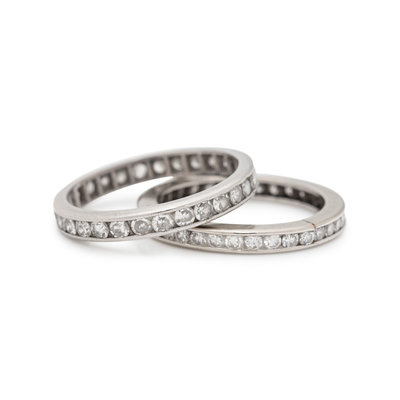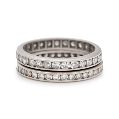 Consisting of a white gold ring containing 35 single cut diamonds weighing approximately 0.70 carat total, ring size 5, together with a platinum ring containing 29 single cut diamonds weighing approximately 0.85 carat total, ring size 5 3/4.
