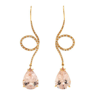 Containing two pear mixed cut morganites measuring approximately 20.30 x 15.25 x 9.15 mm and 75 single and round brilliant cut diamonds weighing approximately 0.40 carat total. Mounted in yellow gold.