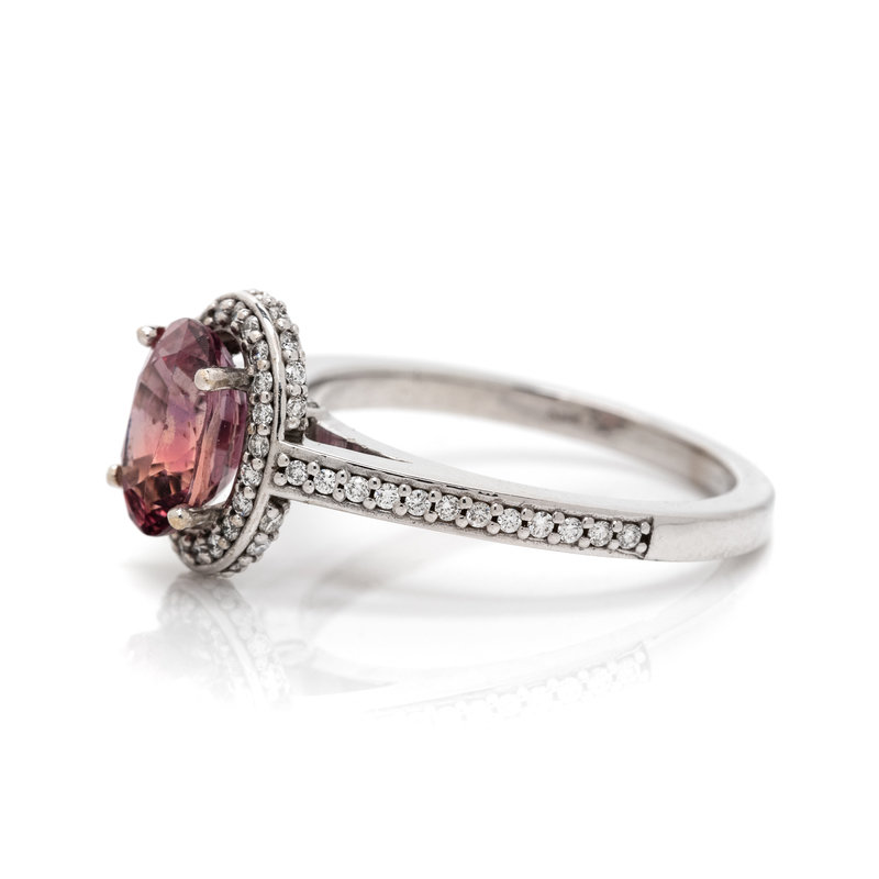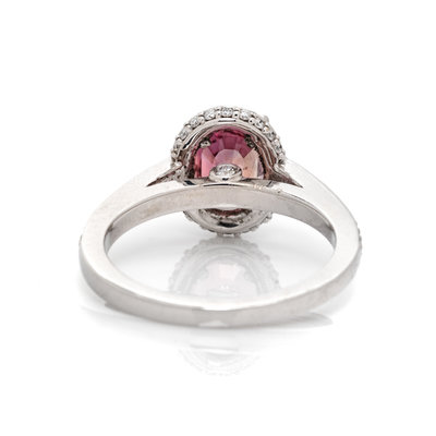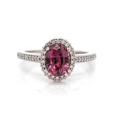 Containing one oval mixed cut pink sapphire measuring approximately 8.60 x 6.10 mm and 66 round brilliant cut diamonds weighing approximately 0.35 carat total. Mounted in white gold.