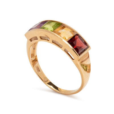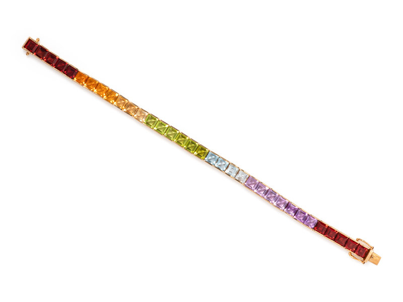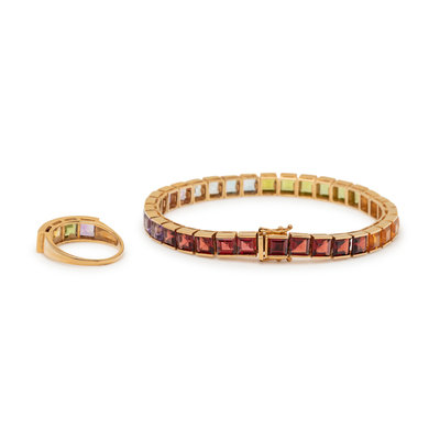Consisting of a bracelet containing 35 square step cut gemstones of various color, together with a ring containing four square step cut gemstones of various color. Mounted in yellow gold.