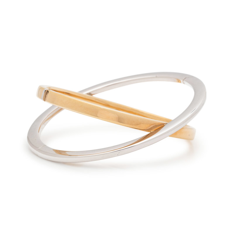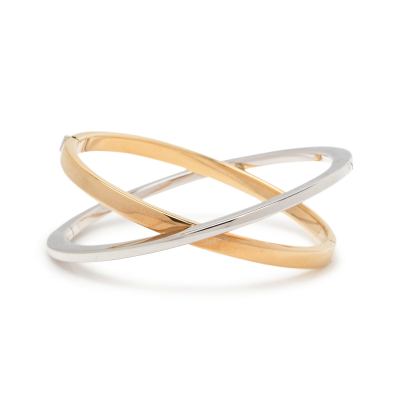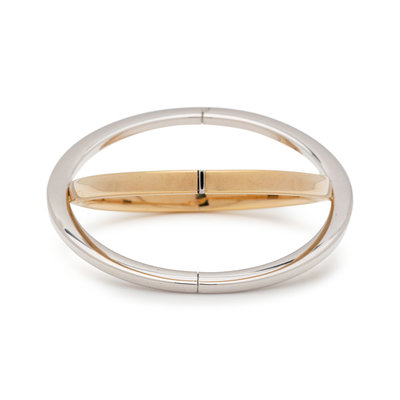 Consisting of connected white and yellow gold bangles, hinged with side clasp.