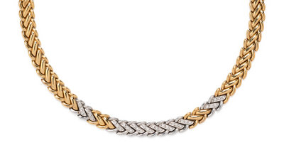 Consisting of a yellow gold link necklace interspersed with platinum links containing 36 round brilliant cut diamonds weighing approximately 0.35 carat total.