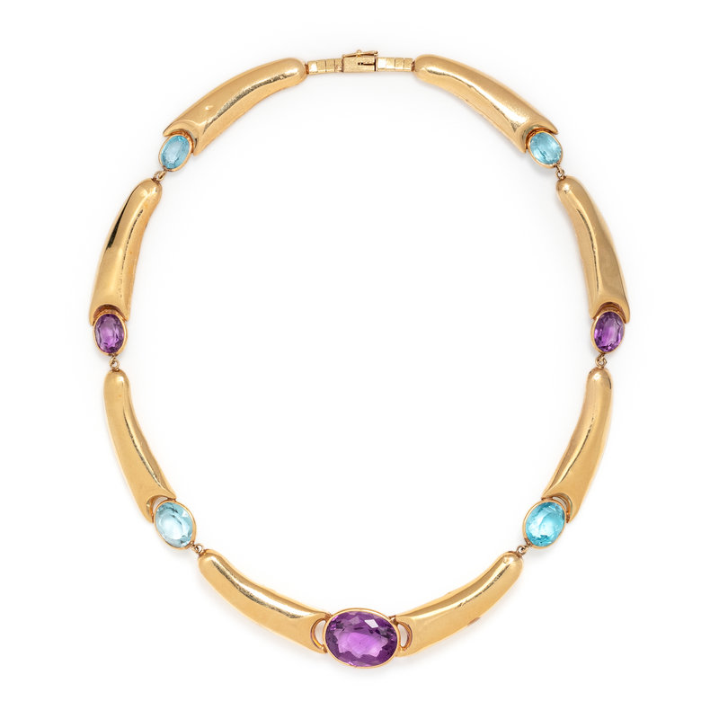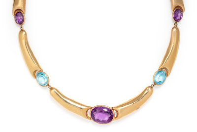 Consisting of curved yellow gold links interspersed with three oval mixed cut amethysts measuring approximately 18.00 x 14.00 x 9.10 mm to 9.50 x 8.00 x 5.60 mm and four oval mixed cut blue topaz measuring approximately 12.00 x 10.00 x 7.60 mm to 9.00 x 7.00 x 5.40 mm.