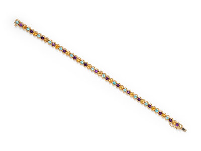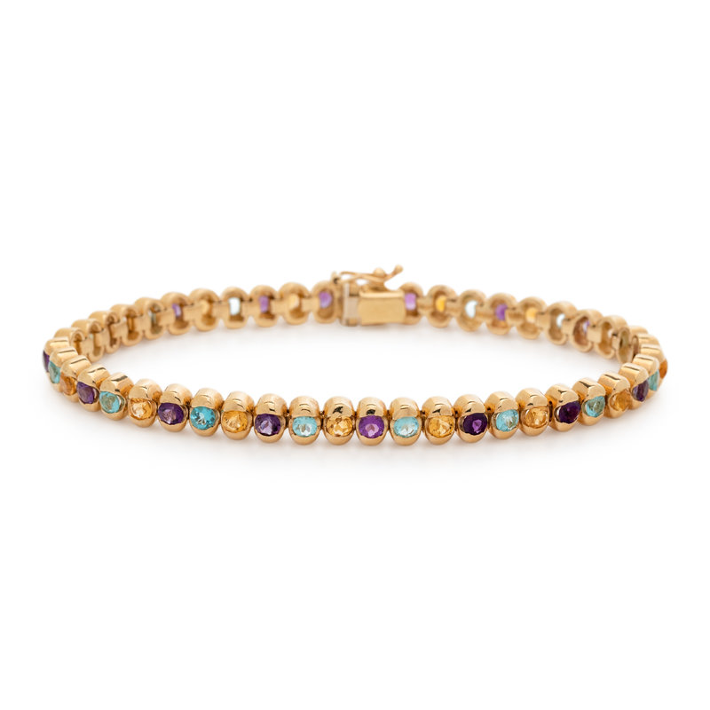 Containing alternating round mixed cut blue topaz, amethyst and citrine. Mounted in yellow gold.