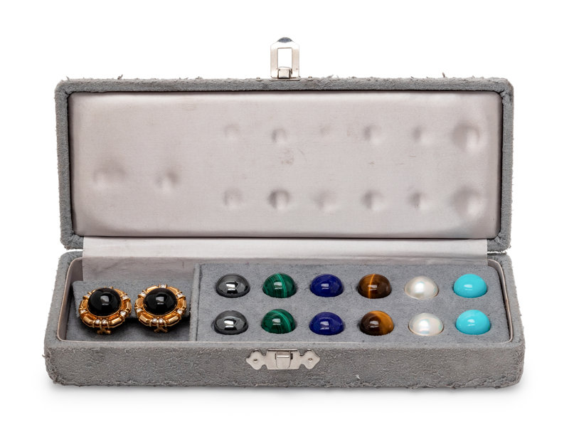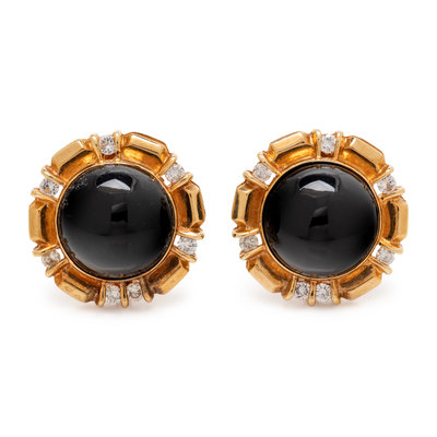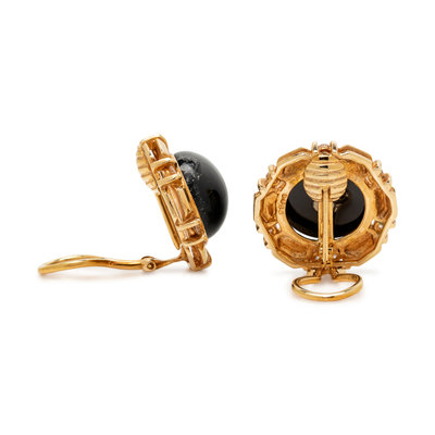 Consisting of yellow gold circular earclips containing 14 round brilliant cut diamonds weighing approximately 0.80 carat total, folding posts with clip backs, together with interchangeable central round cabochons measuring approximately 15.00 mm in diameter including onyx, hematite, malachite, lapis lazuli, tiger's eye, cultured mabe pearl and turquoise.