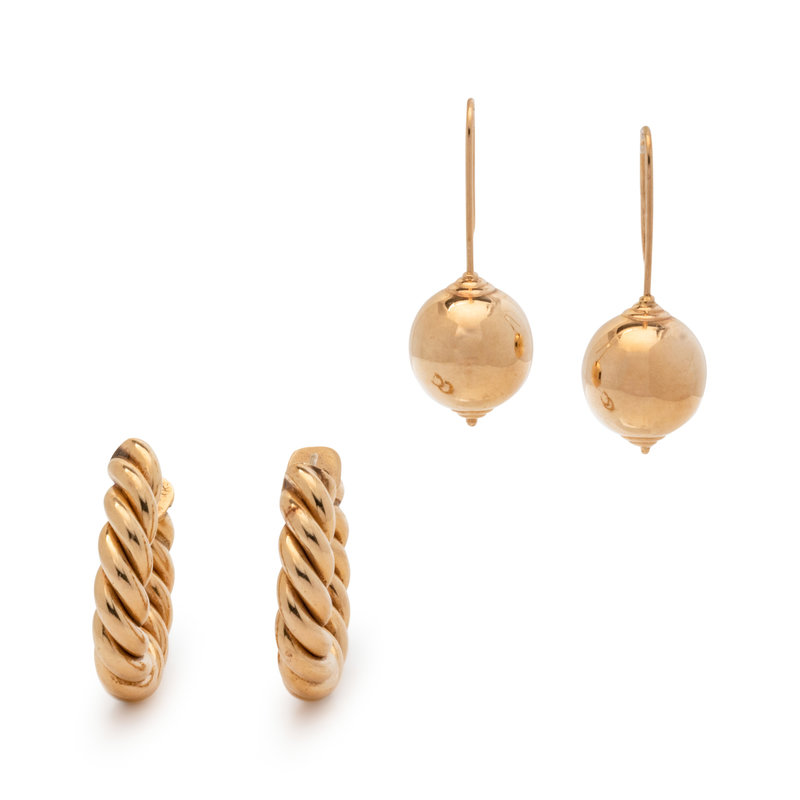 Consisting of twisted hoops measuring approximately 6.10 mm wide, together with a pair of sphere drop earrings.