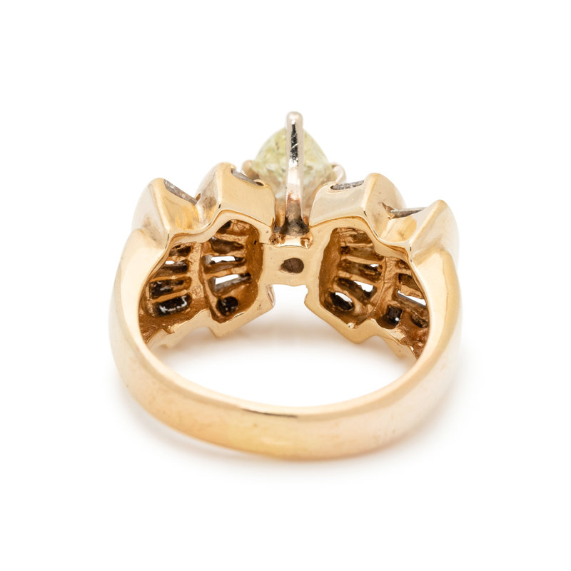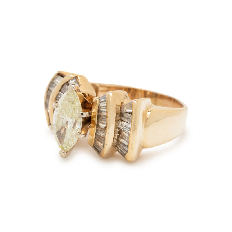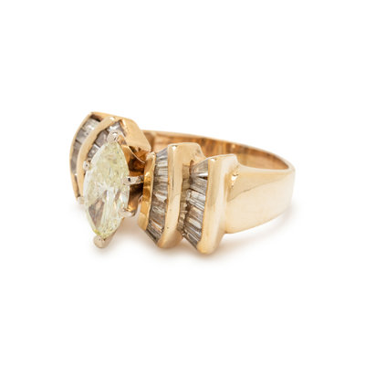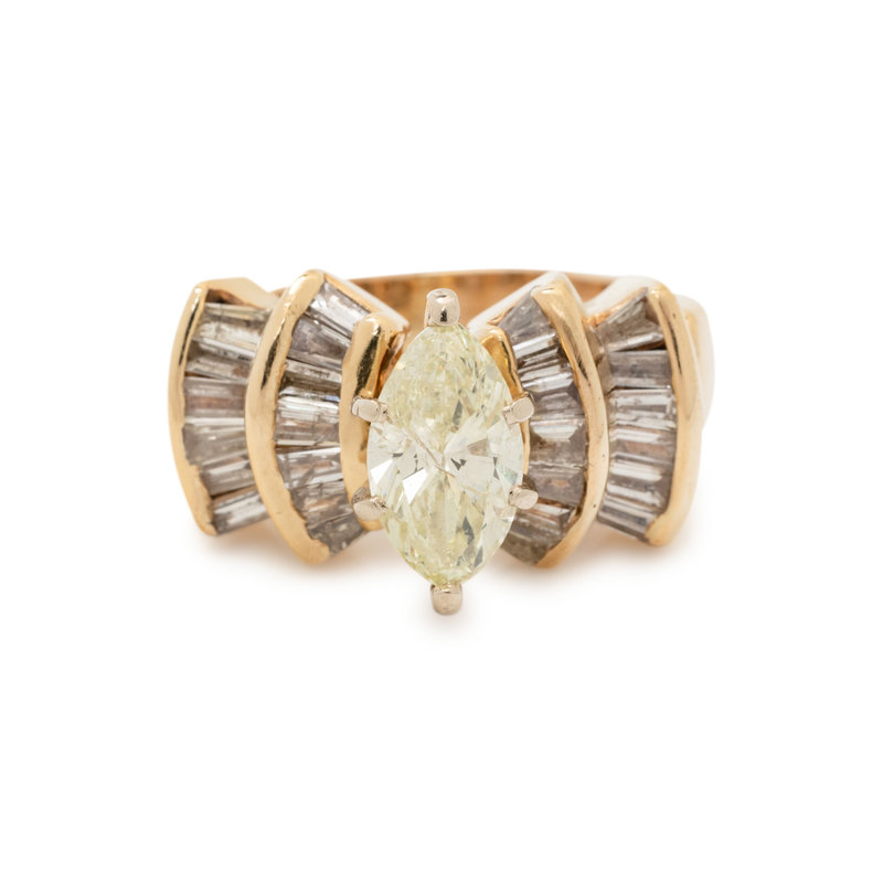 Containing one marquise cut diamond weighing approximately 1.35 carats and 26 baguette cut diamonds weighing approximately 1.50 carats total. Mounted in yellow gold.