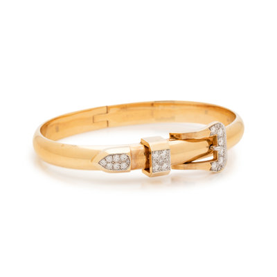 Consisting of a hinged bangle bracelet with belt motif clasp containing 23 round brilliant cut diamonds weighing approximately 0.85 carat total.