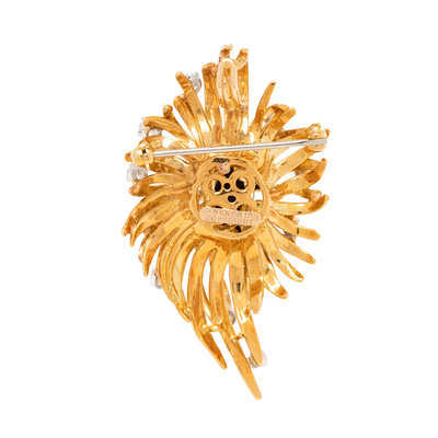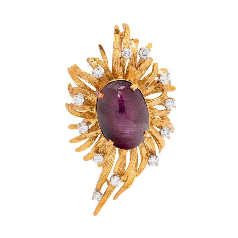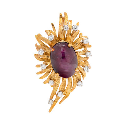 Containing one oval cabochon star ruby measuring approximately 17.90 x 12.95 mm and 12 round brilliant cut diamonds weighing approximately 0.70 carat total. Mounted in yellow gold.