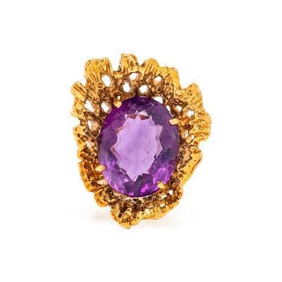 Containing one oval mixed cut amethyst measuring approximately 17.00 x 14.00 x 7.90 mm in a textured modernist mounting.
